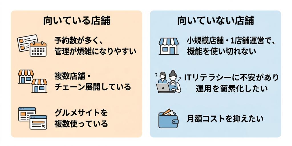 “現場に手間をかけずに使いたい” という店舗には不向きな場合があります。 - 月額コストを抑えたい店舗