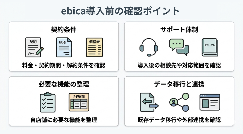 ebicaは多機能で飲食店の業務改善に効果的ですが、導入にあたっては事前に確認しておくべき点があります。以下のポイントを整理しておくことで、導入後のミスマッチを防ぎやすくなります。
