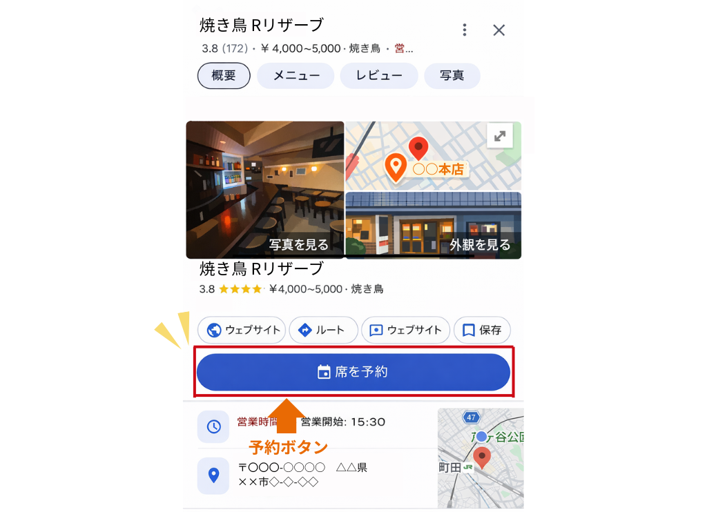 予約ボタン(Googleで予約):Googleパートナーの予約システムのみ表示される専用ボタンで、Google検索内で予約完了まで進められる