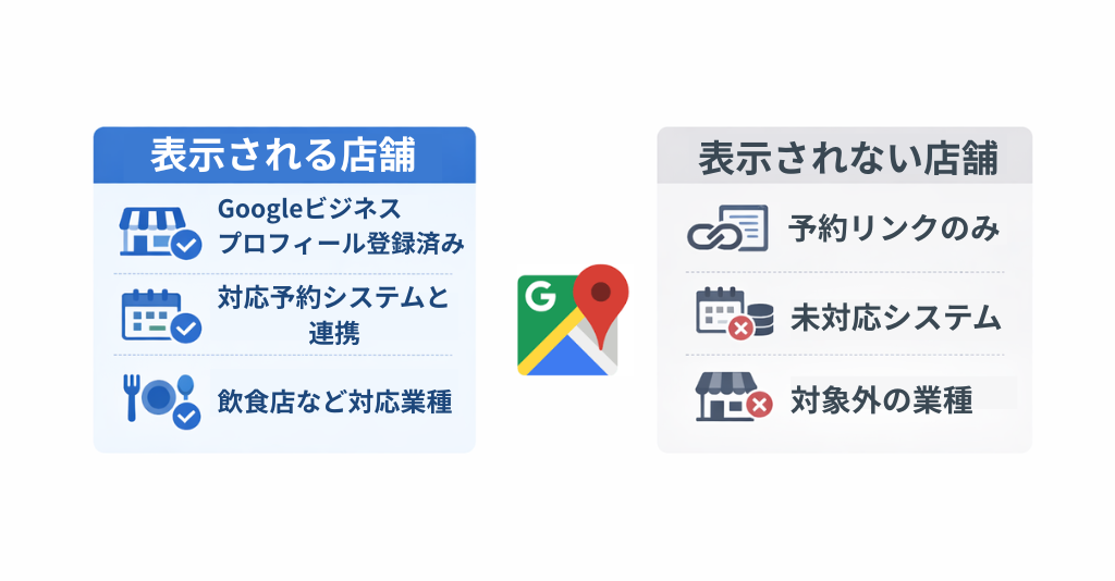 この機能は Googleビジネスプロフィールと連携しており、対応する予約システムを利用すれば、自店舗のサービスをGoogle上で表示・予約可能にできます。