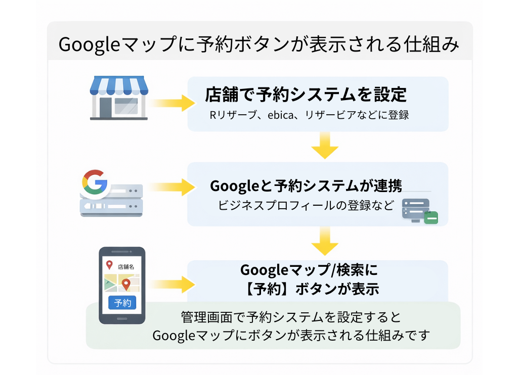 Googleマップの予約ボタンは、Googleビジネスプロフィールに連携されたオンライン予約システムを通じて、ユーザーが直接予約できるようにする仕組みです。