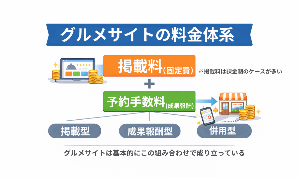 グルメサイトにおける「予約手数料」とは、ユーザーがサイトを通じて店舗に予約を行い、実際に来店した際に発生する成果報酬型の料金です。これはいわゆる「送客課金」とも呼ばれ、飲食店側が1件ごとの送客に対して料金を支払う仕組みです