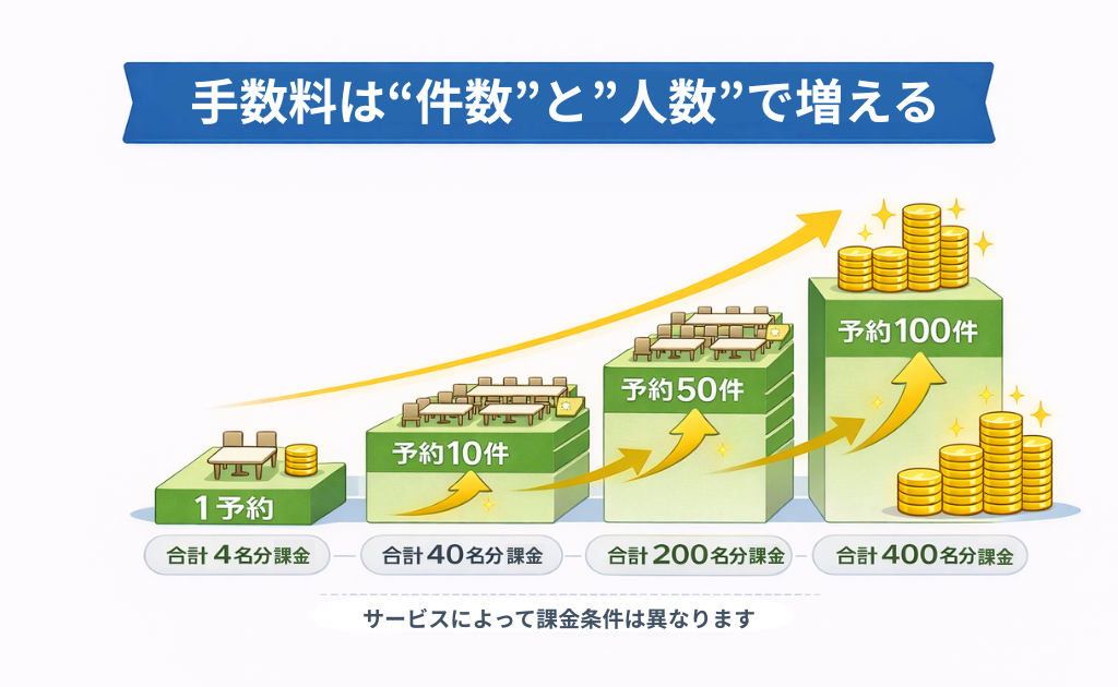 → 多くのサイトでは「1人あたり〇円」で設定されており、人数が多いほど手数料も増加