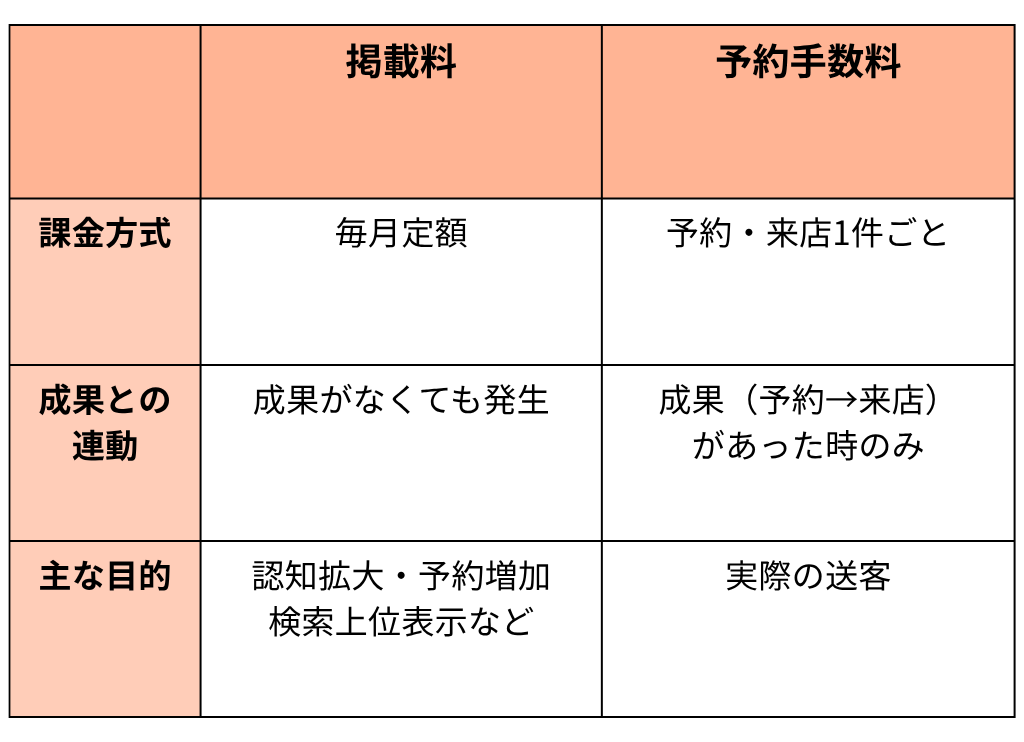 両者を組み合わせて運用する媒体が多く、「有料掲載+予約手数料課金」という形態が主流です。したがって、月額コストと成果報酬を合わせたトータルコストで比較することが重要です。