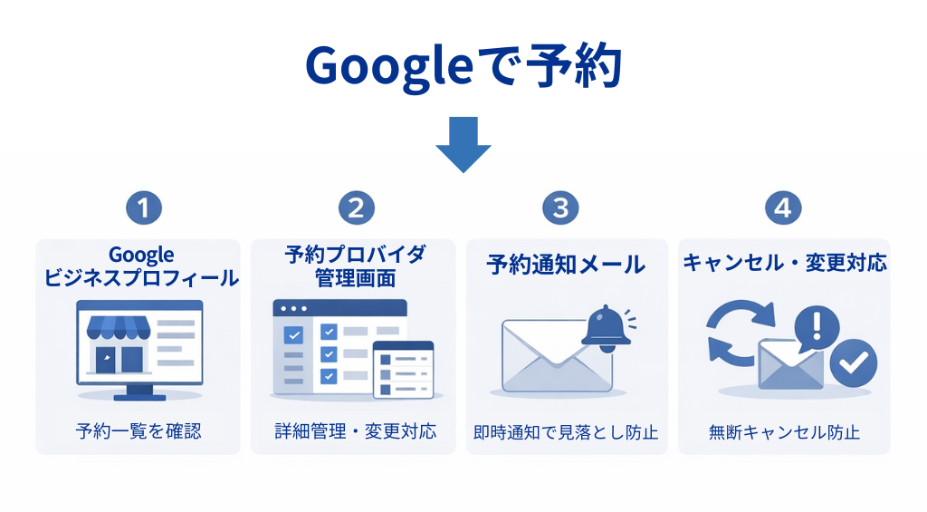 Googleで予約を通じて受け付けた予約情報は、基本的にGoogleのシステムを介して管理されます。そのため、