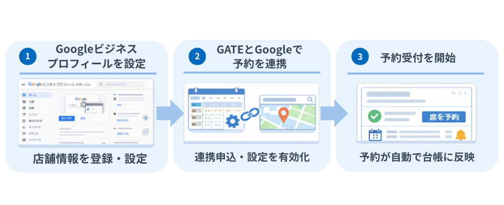 GATEと連携することで、Google検索やGoogleマップからの予約が自動的にGATEの予約システムに反映されるようになります。