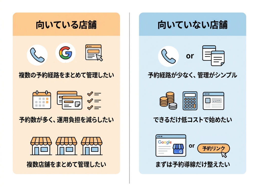 たとえば、「予約経路が複数あるか」「変更やキャンセル対応が多いか」「複数店舗管理が必要か」といった点を整理すると、導入の必要性が見えやすくなります。