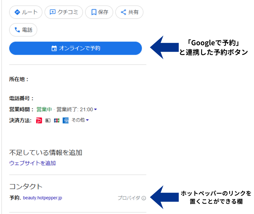 が必要になります。ホットペッパーは現在、このGoogleの連携サービスには含まれていないため、「オンラインで予約」の公式予約ボタンとして表示することはできません。