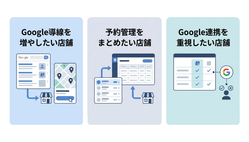それぞれ機能や運用方針が異なるため、Googleで予約への対応有無だけでなく、予約管理の考え方や店舗の運用スタイルに合うかどうかを基準に選ぶことが大切です。