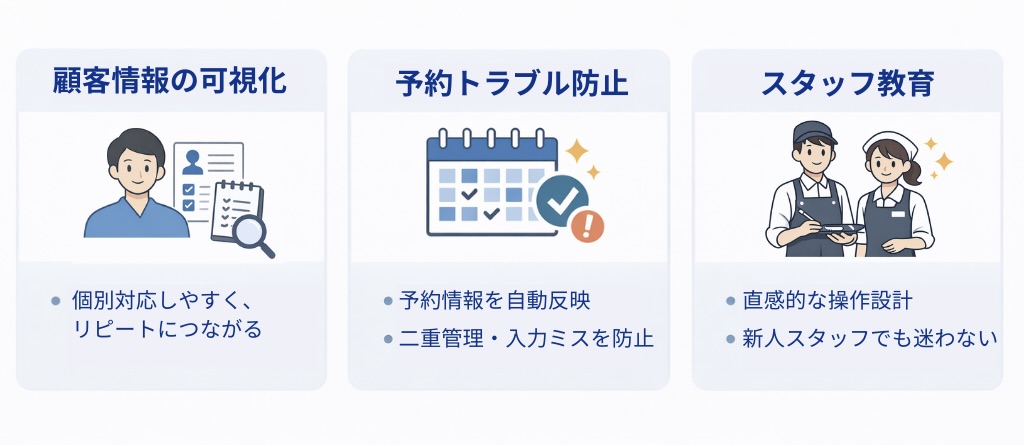 また、予約情報が自動で反映されることで、予約ミスや二重管理によるトラブルのリスクも軽減されます。新人スタッフでも直感的に操作できる設計も評価されており、研修コストの削減にも寄与します。