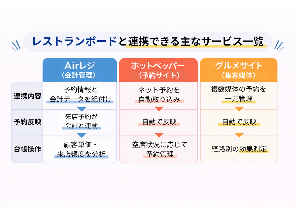 予約や顧客情報を効率的に管理できる「レストランボード」は、他サービスと連携することでさらに利便性が向上します。