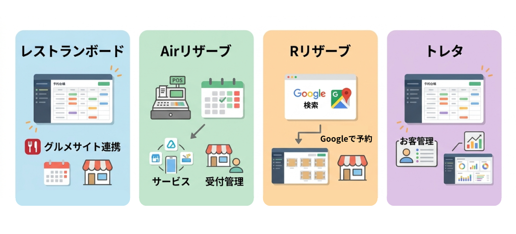 ここでは、よく比較される主要な予約管理ツールであるAirレジ(予約機能)、トレタ、Rリザーブ(アールリザーブ) と比較し、それぞれの特徴や違いを整理します。