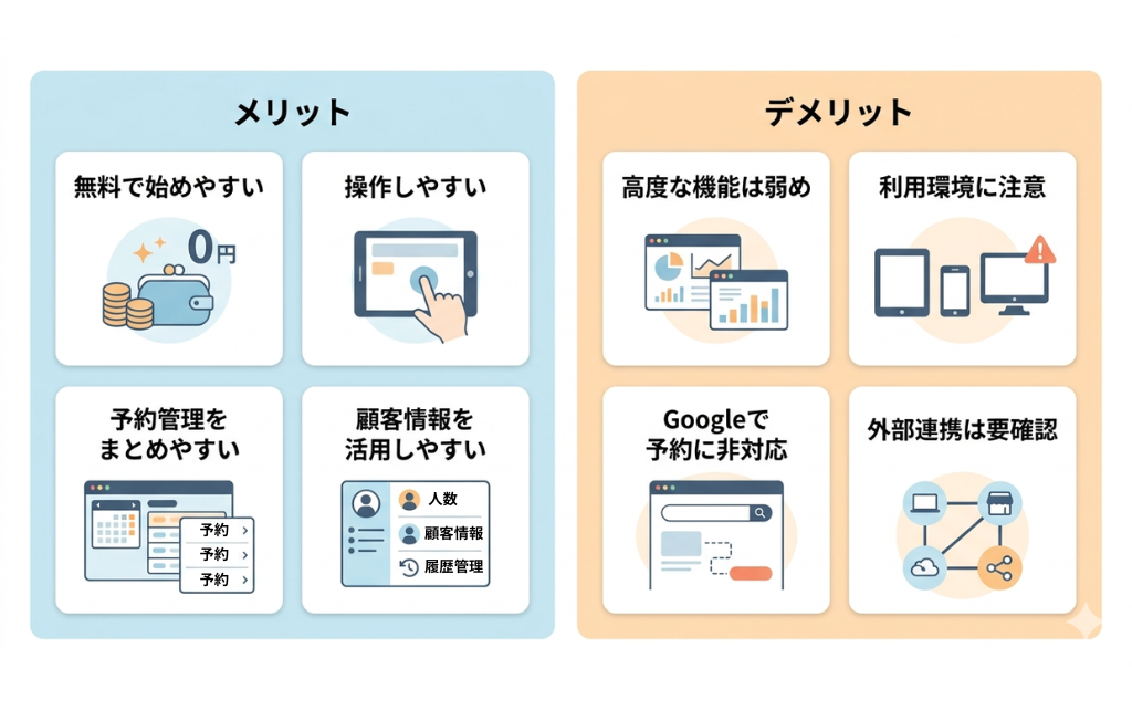 操作も比較的わかりやすい一方で、Googleで予約に対応していないなどの制限もあるため、自店の運用に合うか確認したうえで導入を検討するとよいでしょう。