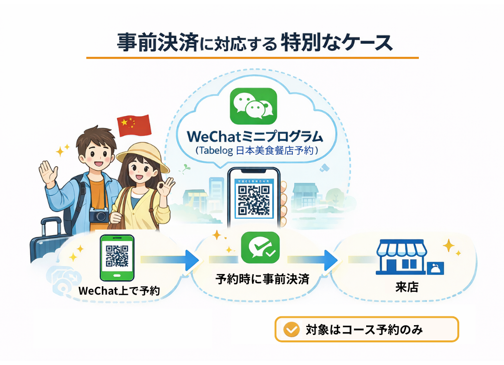 食べログの通常のネット予約では事前決済は利用できません。ただし、「WeChatミニプログラム(Tabelog 日本美食餐店予約)」経由のコース予約に限り、事前決済に対応しています。