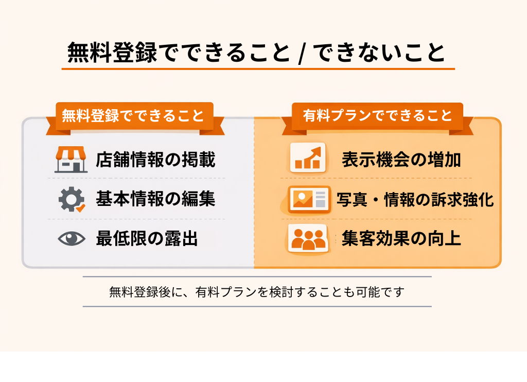 無料プランは「最低限の店舗情報を載せる」程度に留まります。一方、有料プランは「予約・露出・データ分析」といった集客に直結する機能が揃っており、ユーザーへの訴求力が大きく異なります。