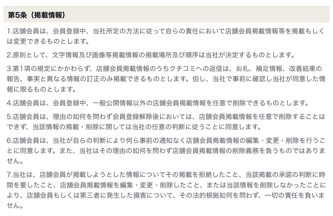 実際の店舗規約には、登録会員向けに以下のような規約があります。同様の事象は登録していない店舗にもあてはまると言えるでしょう。(参考:食べログ店舗会員規約)
