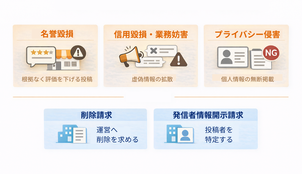 「料理が不衛生だった」「店主が詐欺をしている」など、根拠なく店舗や経営者の社会的評価を下げる表現は名誉毀損に該当する可能性があります。