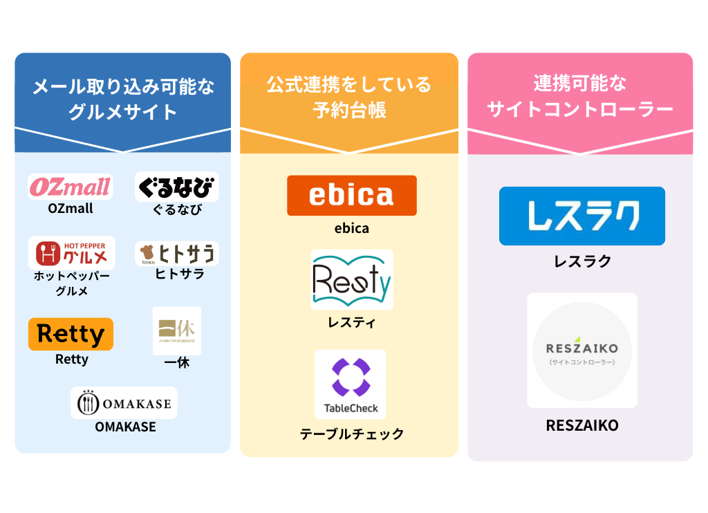 メール取り込みが可能なグルメサイトと、取り込み可能な予約の種類をそれぞれご紹介します。現在食べログノートを予約台帳として活用している方は必見です。