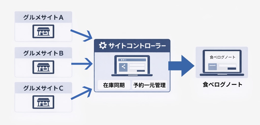 サイトコントローラーとは複数のグルメサイトと在庫を同期する在庫管理システムのことを指します。サイトコントローラーを食べログノートと連携すれば、他社サイトの予約やキャンセル情報も自動で反映され、複数サイトを横断した在庫管理が可能です。