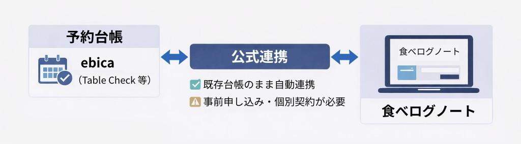 ebicaやResty、TableCheckなどの予約台帳を利用中の店舗は、食べログノートと公式連携することで、予約管理の効率化やトラブル防止につながります。公式連携を行えば、両システム間で卓情報や在庫が自動同期され、ダブルブッキングのリスクを低減できます。