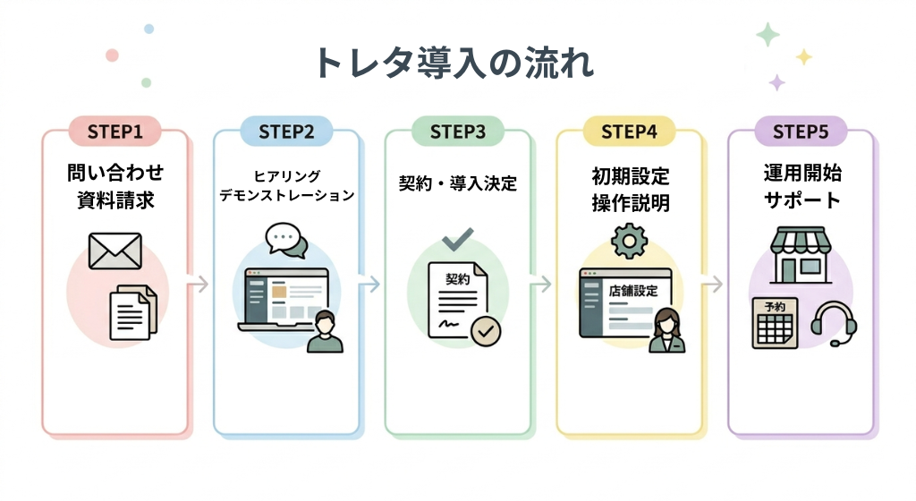 トレタの導入は、以下のようなステップで進みます。初期設定から運用開始まで、専任の担当者がサポートしてくれるため、初めてのIT導入でも安心して進めることが可能です。